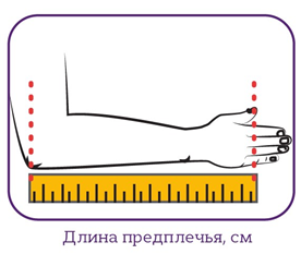 Для подбора размера следует измерить длину предплечья от вершины локтевого отростка до пятно-фалангового сустава 5-го пальца.