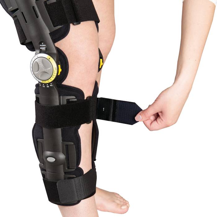 • закрепите манжеты на голени и бедре с помощью застежек «Велкро» так, чтобы шарниры располагались по бокам коленного сустава
