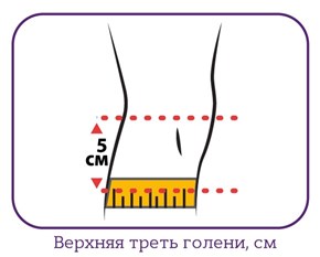 Для подбора размера следует измерить окружность нижней трети бедра на 15 см выше середины надколенника и верхней трети голени на 5 см ниже середины надколенника.