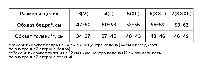 Для подбора размера следует измерить окружность нижней трети бедра на 15 см выше середины надколенника и верхней трети голени на 5 см ниже середины надколенника.