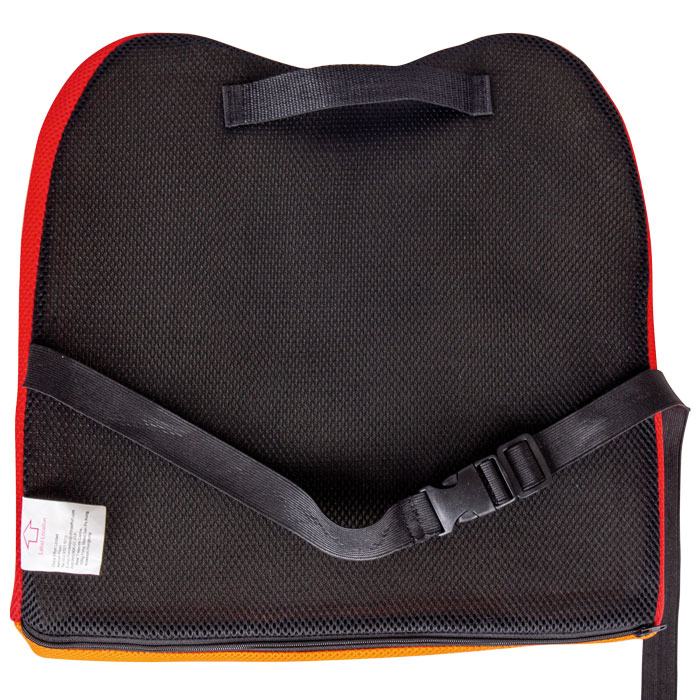 • закрепить подушку ремнем на спинке сиденья в области поясницы широким основанием книзу