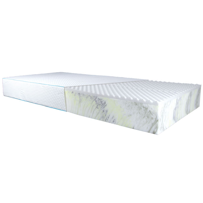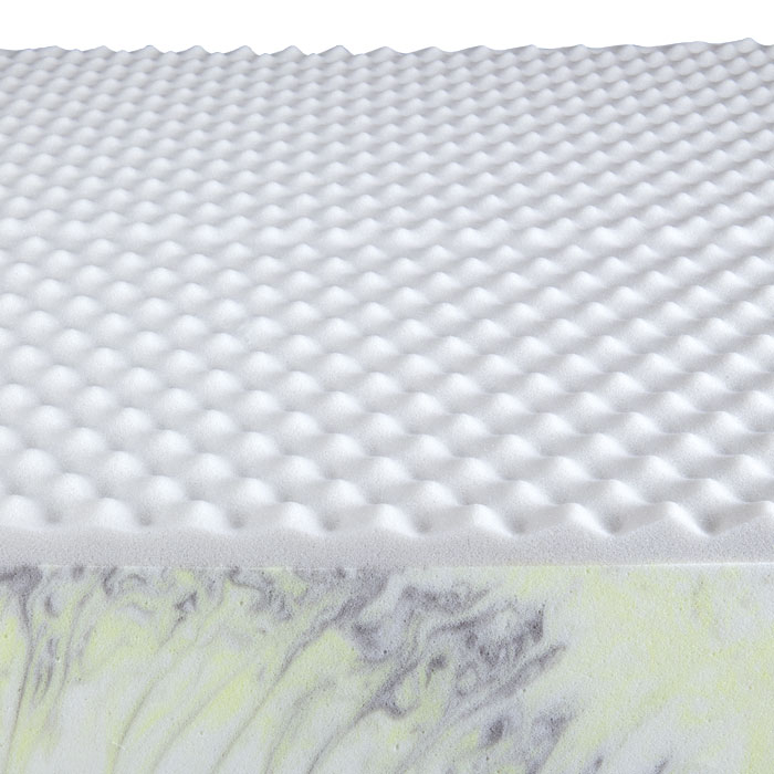 - верхний слой с открытыми ячейками состоит из вязкоэластичного пенополиуретана, обладающего «эффектом памяти»: изделие принимает индивидуальную форму тела, равномерно распределяя давление